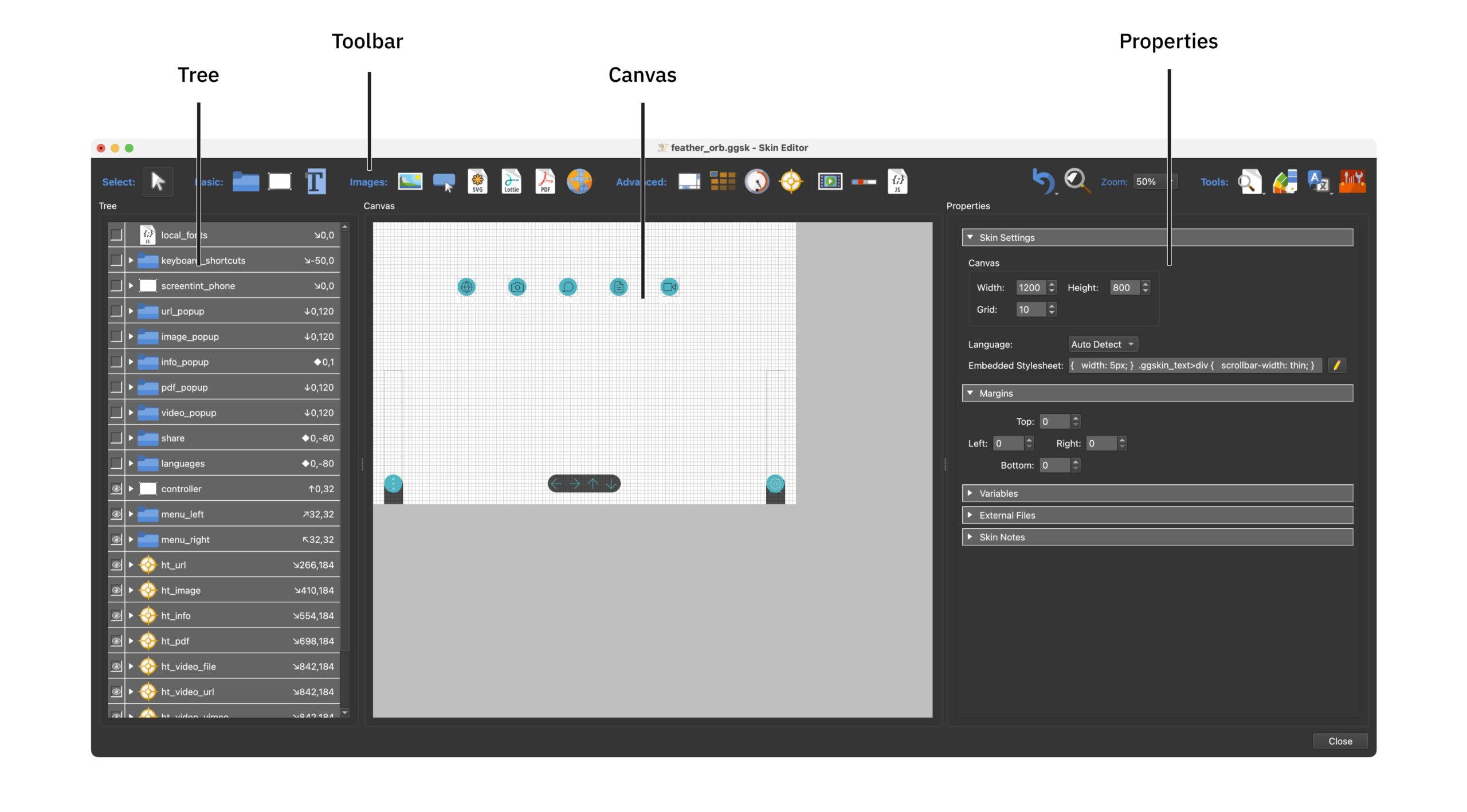 Those familiar with Pano2VR will recognize the Skin Editor. You can apply all your knowledge and experience of Pano2VR’s Skin Editor to Object2VR’s.