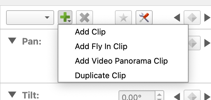 1. Click and hold the Add/Duplicate Clip button in the animation panel (green plus) and choose Add Video Panorama Clip.