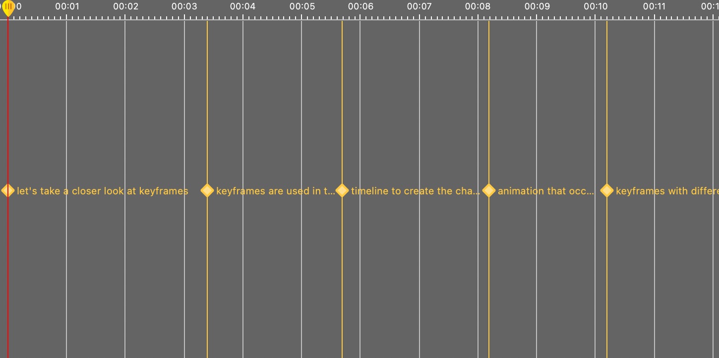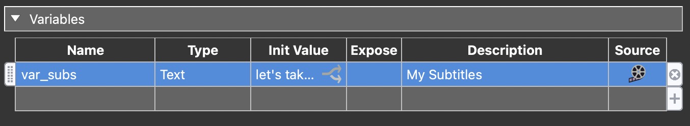 Track Prameters When the file is added, the track is populated with keyframes. If you zoom in to the track, you’ll see that the keyframes are text variables.