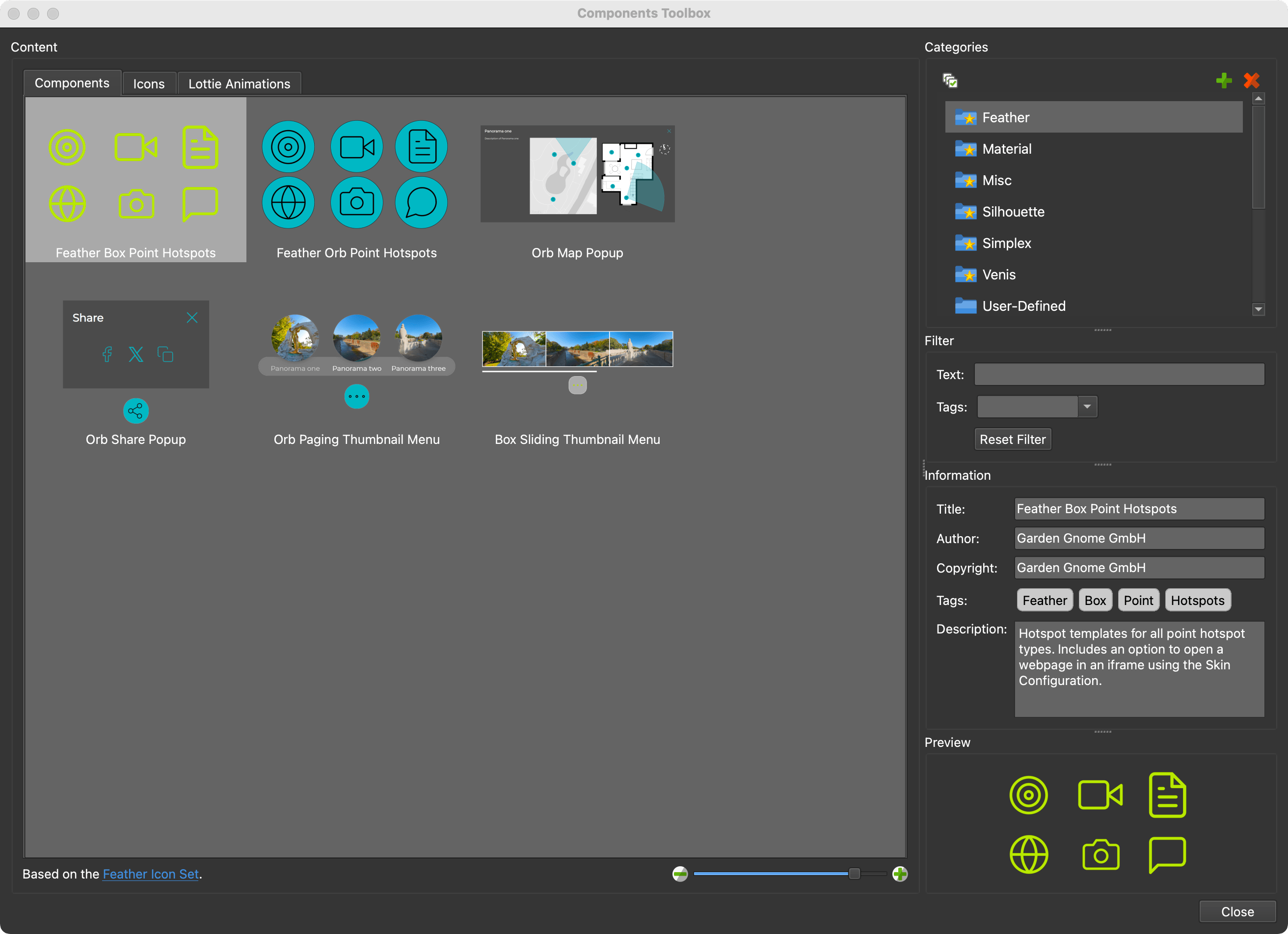 - Choose any of the built-in categories. For this example, we’ll use Feather. Double-click Feather Box Point Hotspots to add the component to the skin.