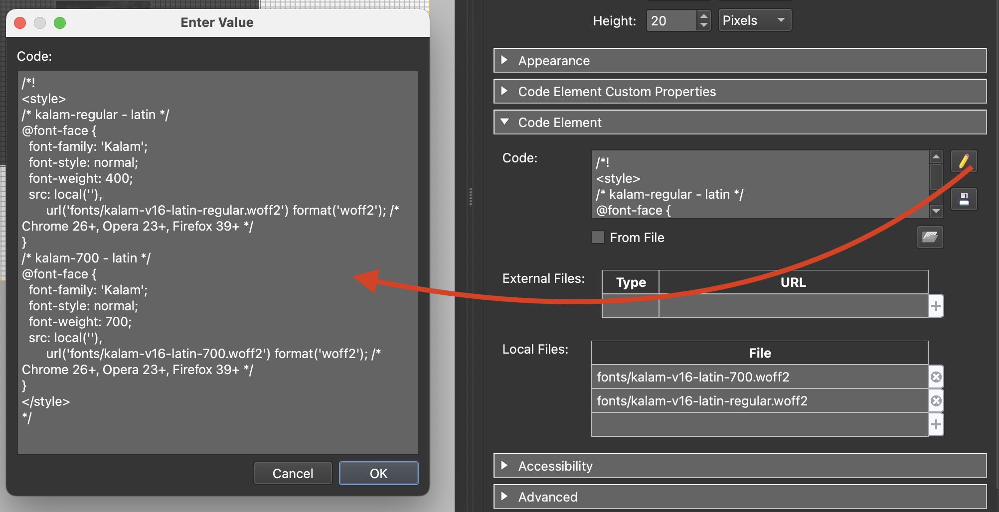1. In the Code Element, add the font files to Local Files. Click the plus sign, navigate to the files on your computer and select them to add.