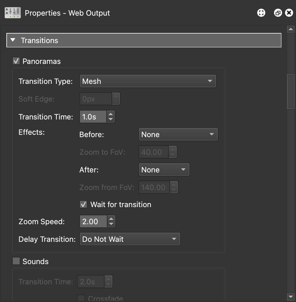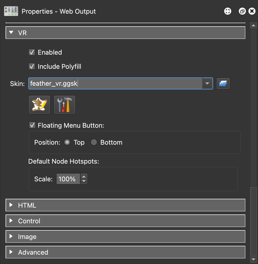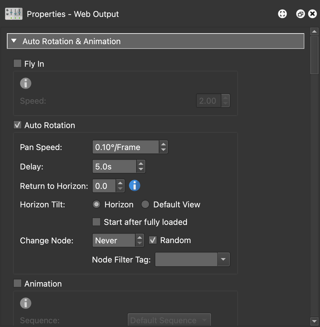 Add Autorotation, Transitions, and a VR output from the Web Output Properties.
