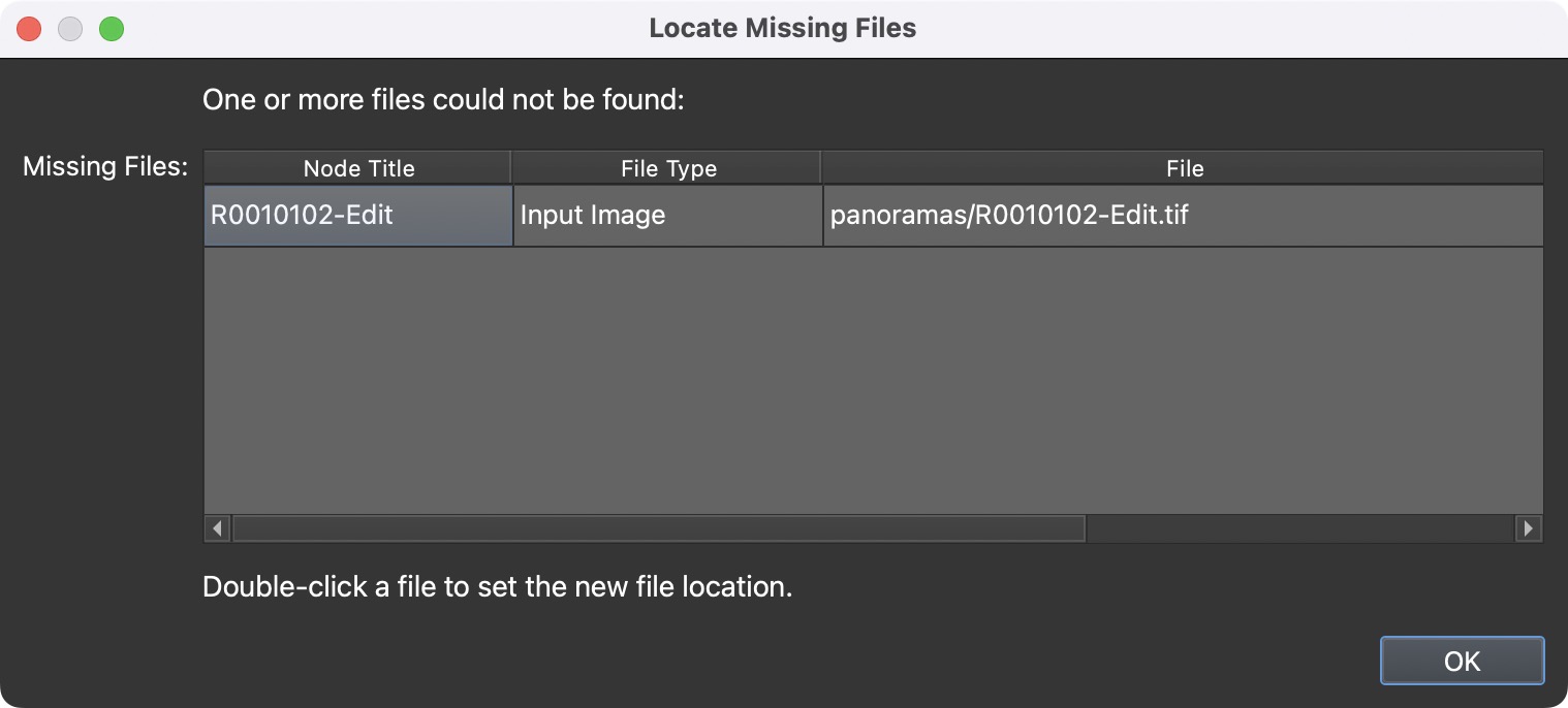 If assets are missing from a project, Pano2VR will open a Locate Missing Files window. To reassign the file’s file path: