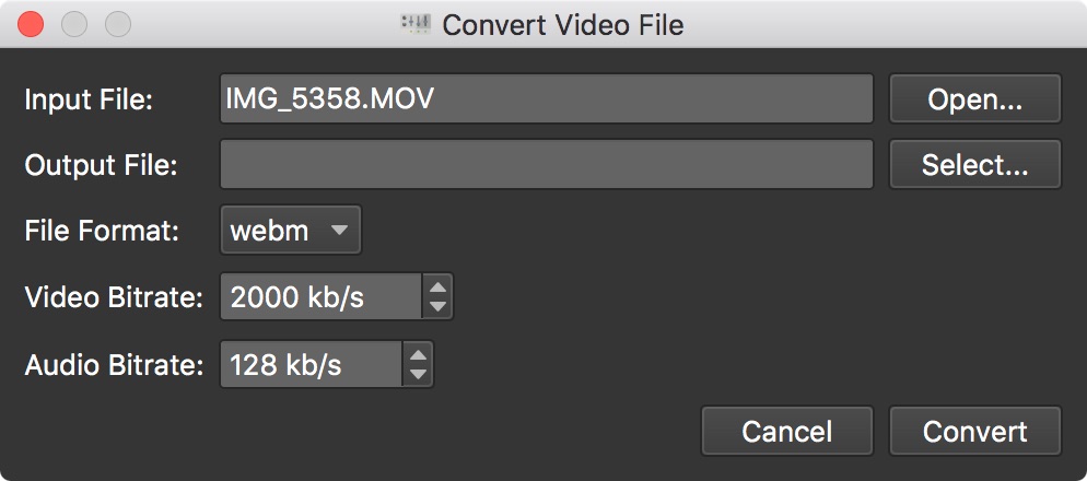 In the Convert Video File dialog, input file path will be populated. But if this needs to be changed, click Open.
