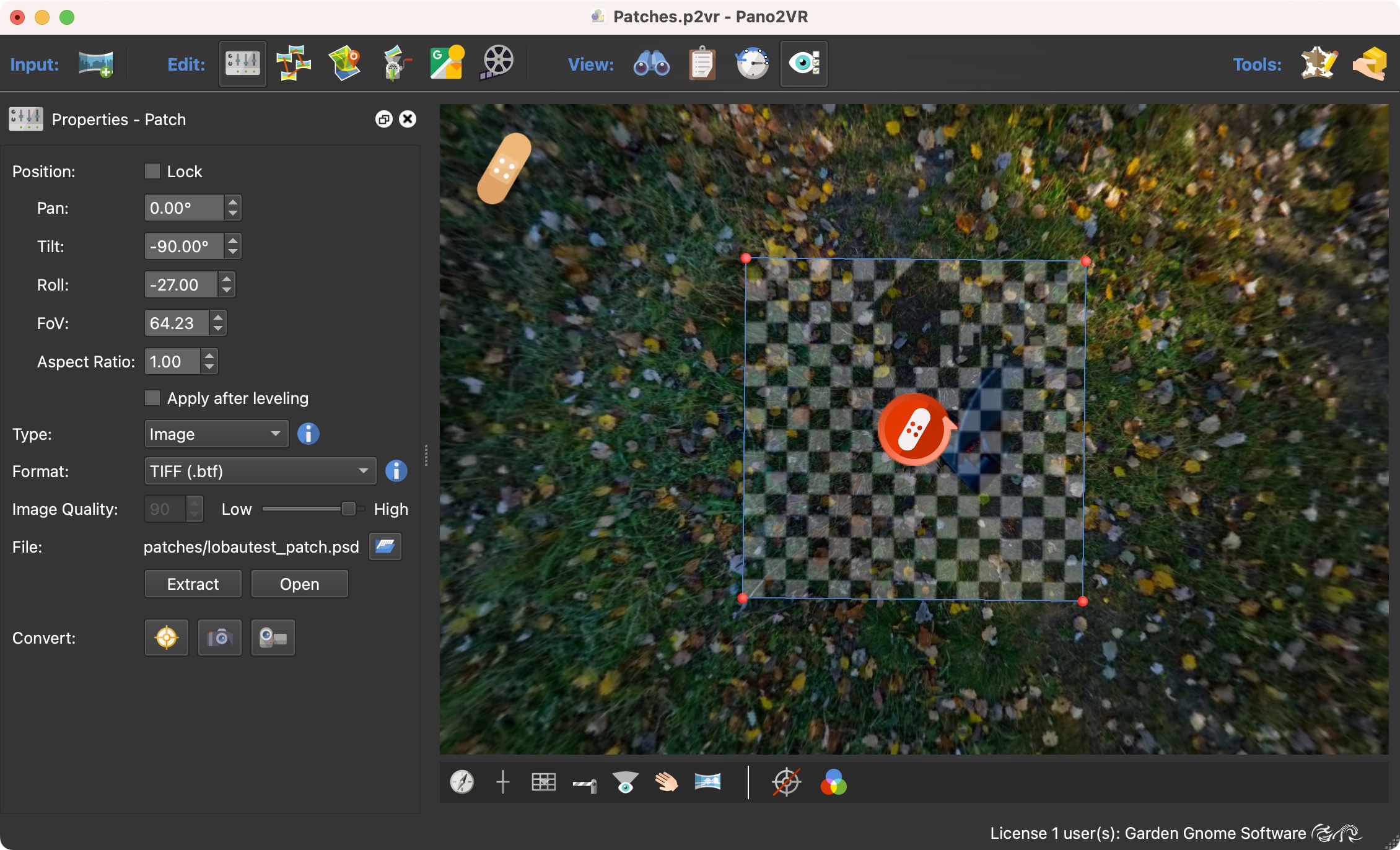 Patching allows you to non-destructively extract a non-distorted portion of the input image without having to remap or convert the whole image. Add patches to hide faces, to add nadir caps, hide drones, and even adding roll-over effects.