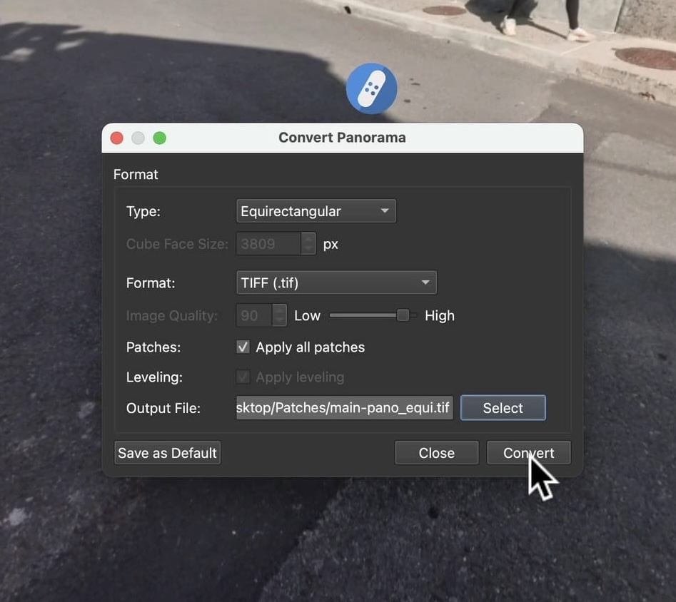 - In the dialog that opens, choose, Equirectangular and Tiff. Make sure Apply all Patches is selected.