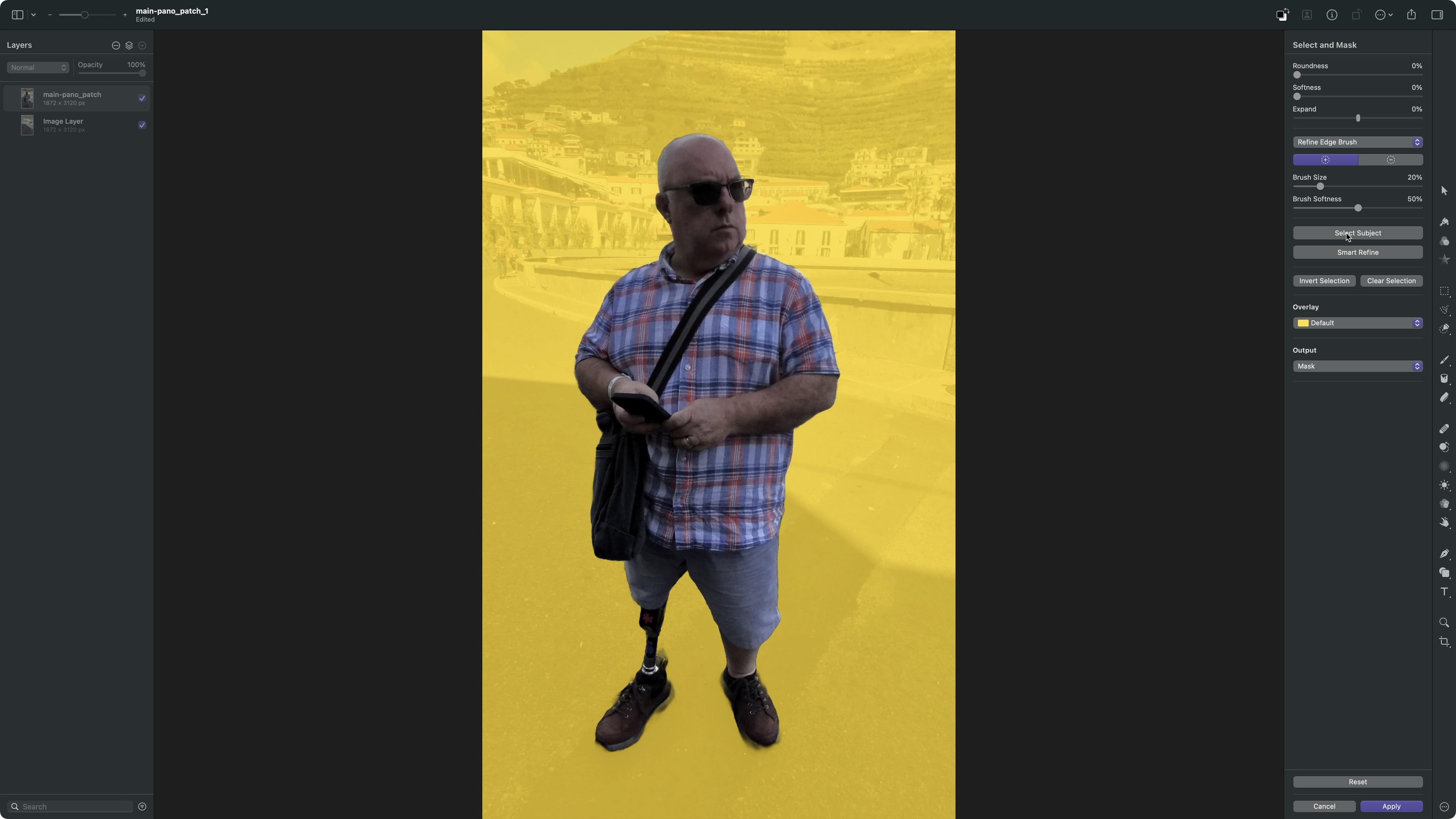 Mask applied. - Use any method to erase the object from the image. In our example, we used “Select Subject” and removed the subject. Then used the paint brush to soften the edges of the mask.