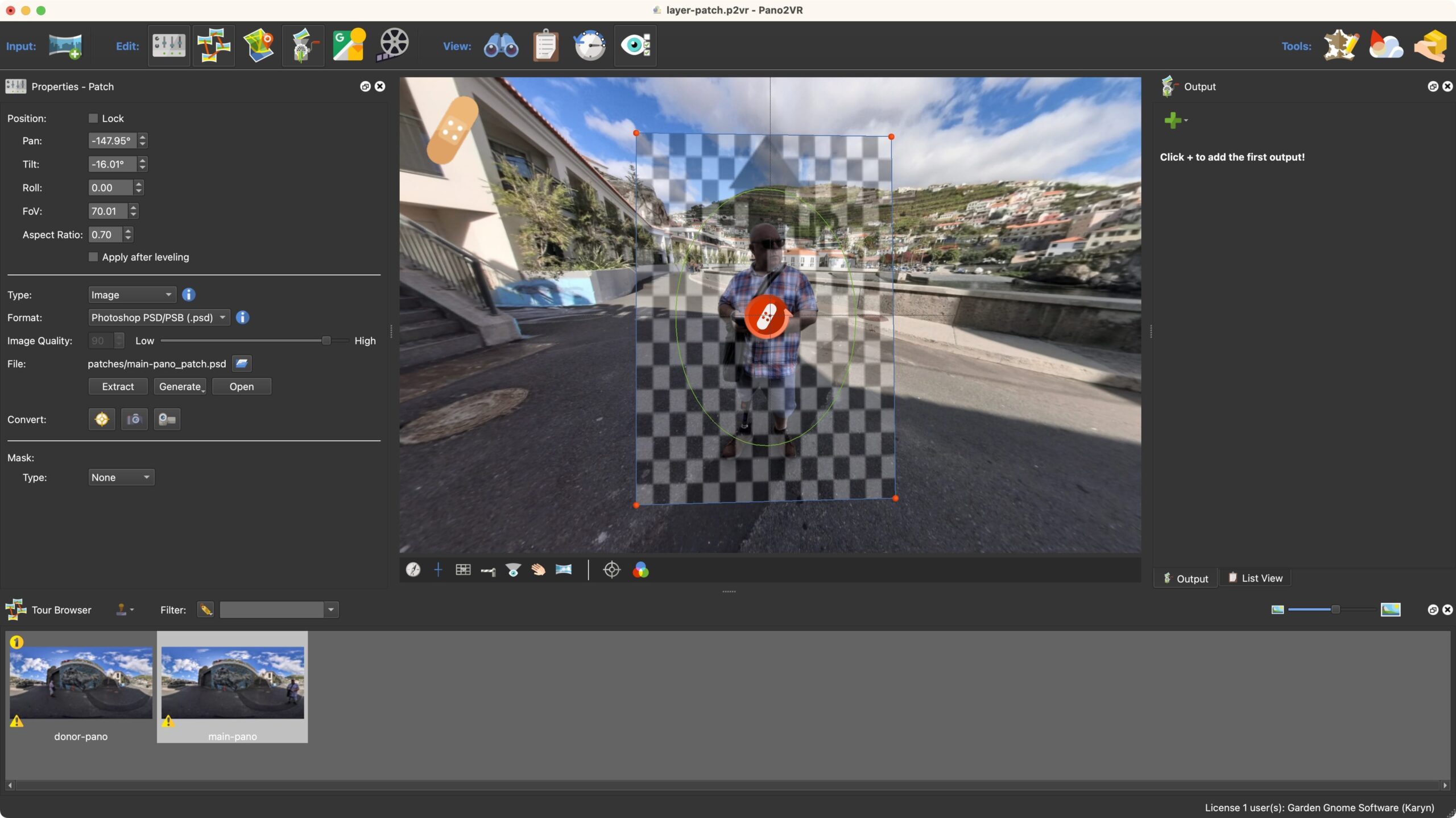 Shot 2. The Donor Image. This will fill the hole left when Martin is removed from the Main Image. - In Pano2VR, add both images to the Tour Browser. Give them a title if your file names are not descriptive enough, so you can easily identify each image. We use Main and Donor.