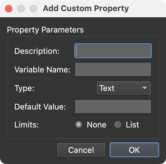 Click the plus to add a custom property. A dialog will appear where you define the parameters of the custom property: