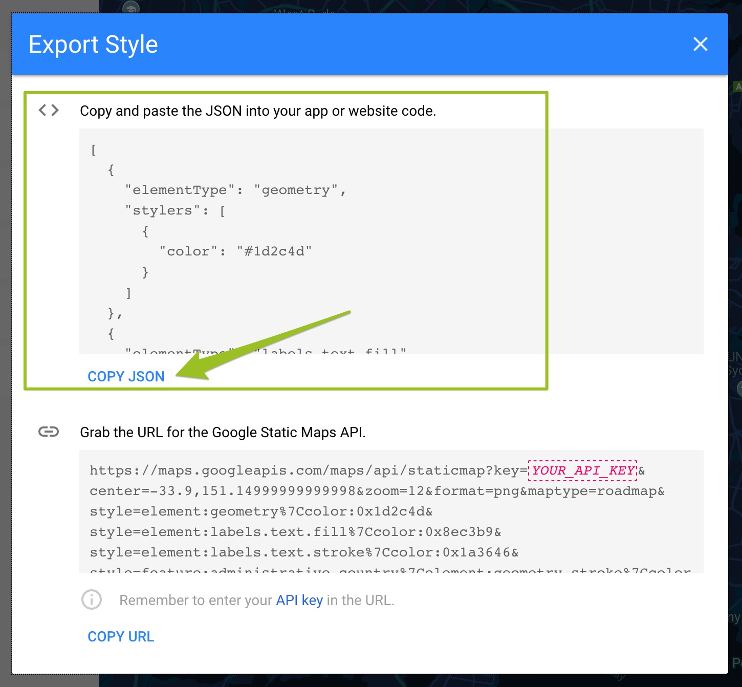 4. Add the custom style code. Styles can be created using the Google Maps Platform Styling Wizard. When you’re done, click Finish in the wizard and copy the JSON code into the Google Custom Style Code field.