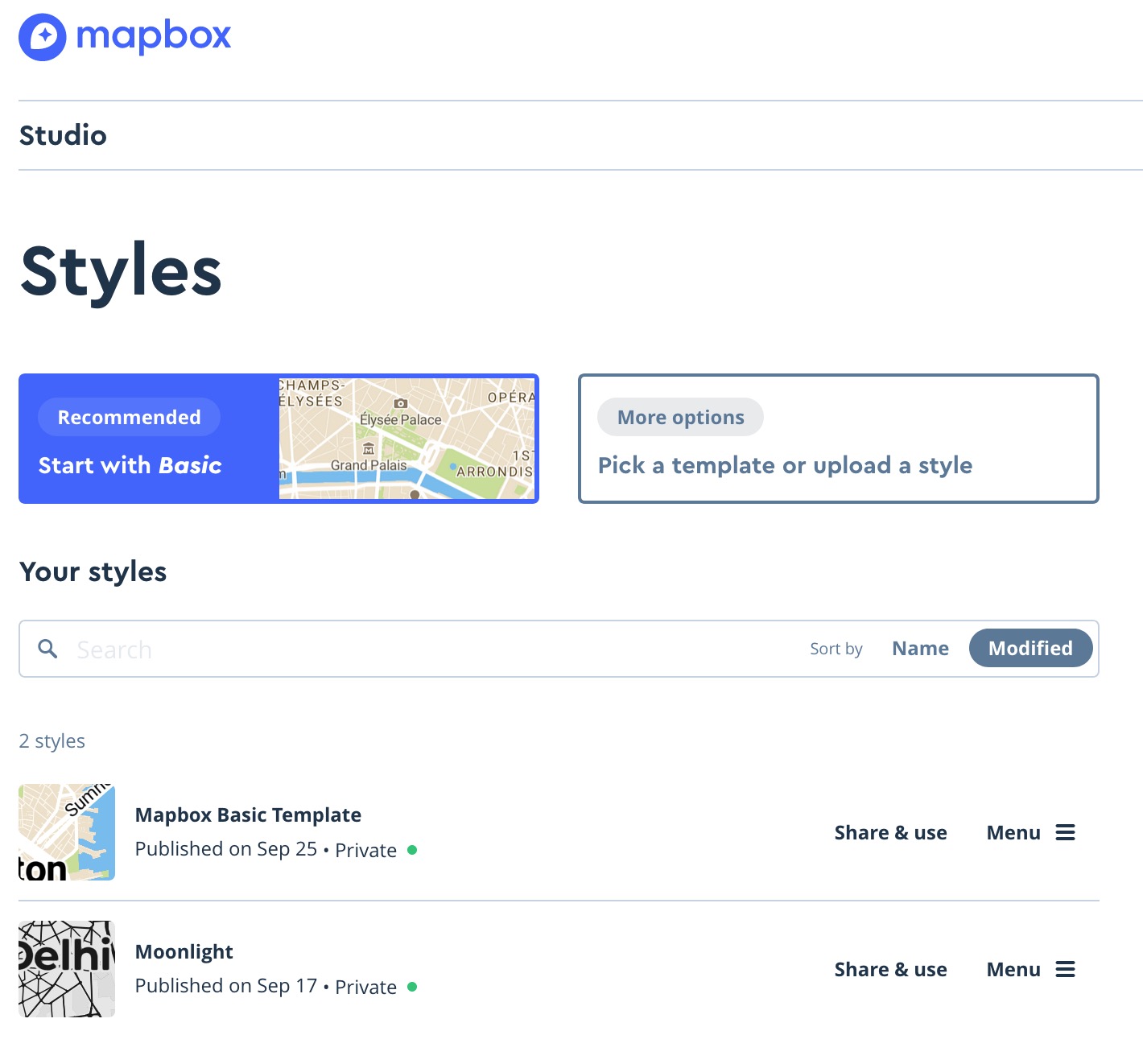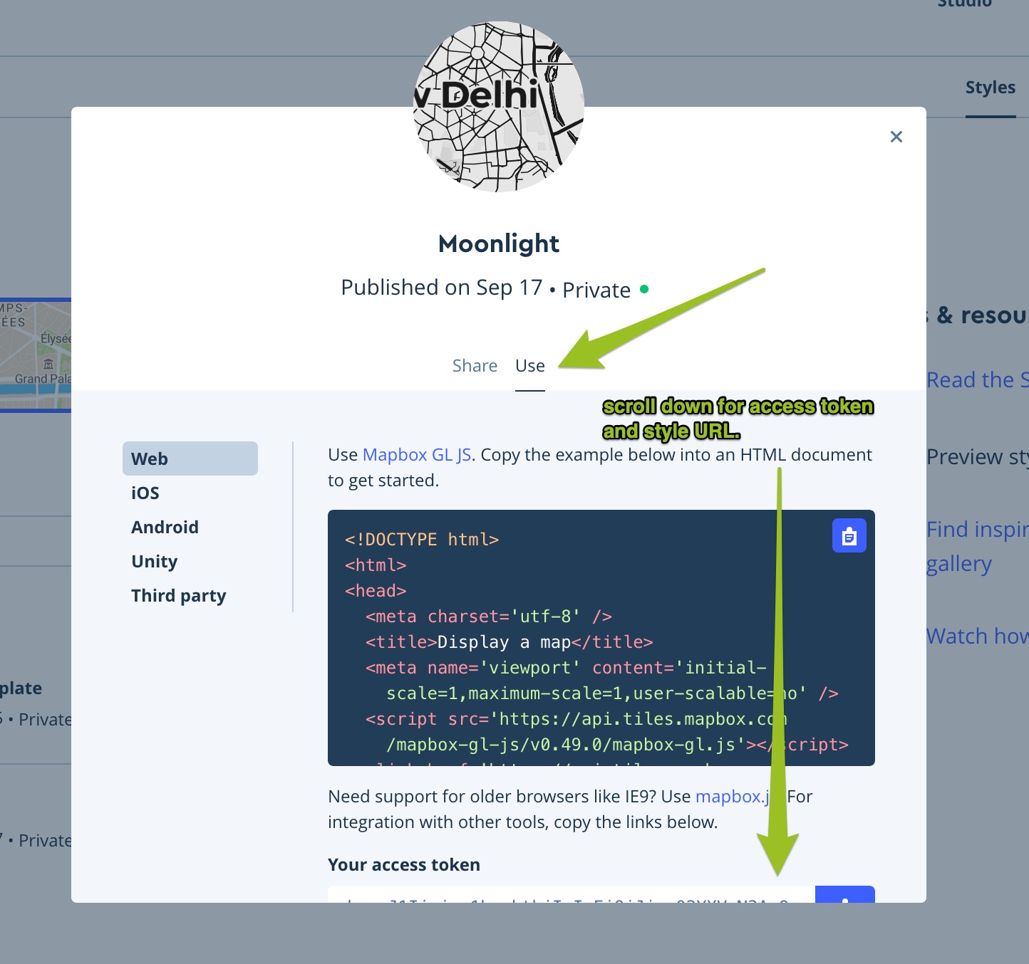 5. Add your Style URL. Once you’ve created a style using mapbox studio, click, Share & use and then click, Use. With Web selected in the side bar, scroll down until you see both the access token and style URL.