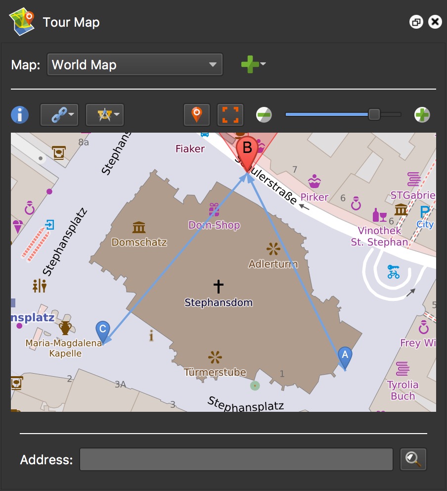In the Tour Map below, Node B was the active node (selected first). Nodes A and C were also selected and were linked to node B.