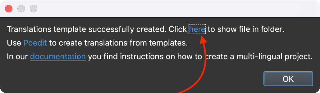 4. Click the button for Generate Translations Template. This will automatically create the translation template file and add it to the translations folder. This is a POT file that is compatible with Poedit.
