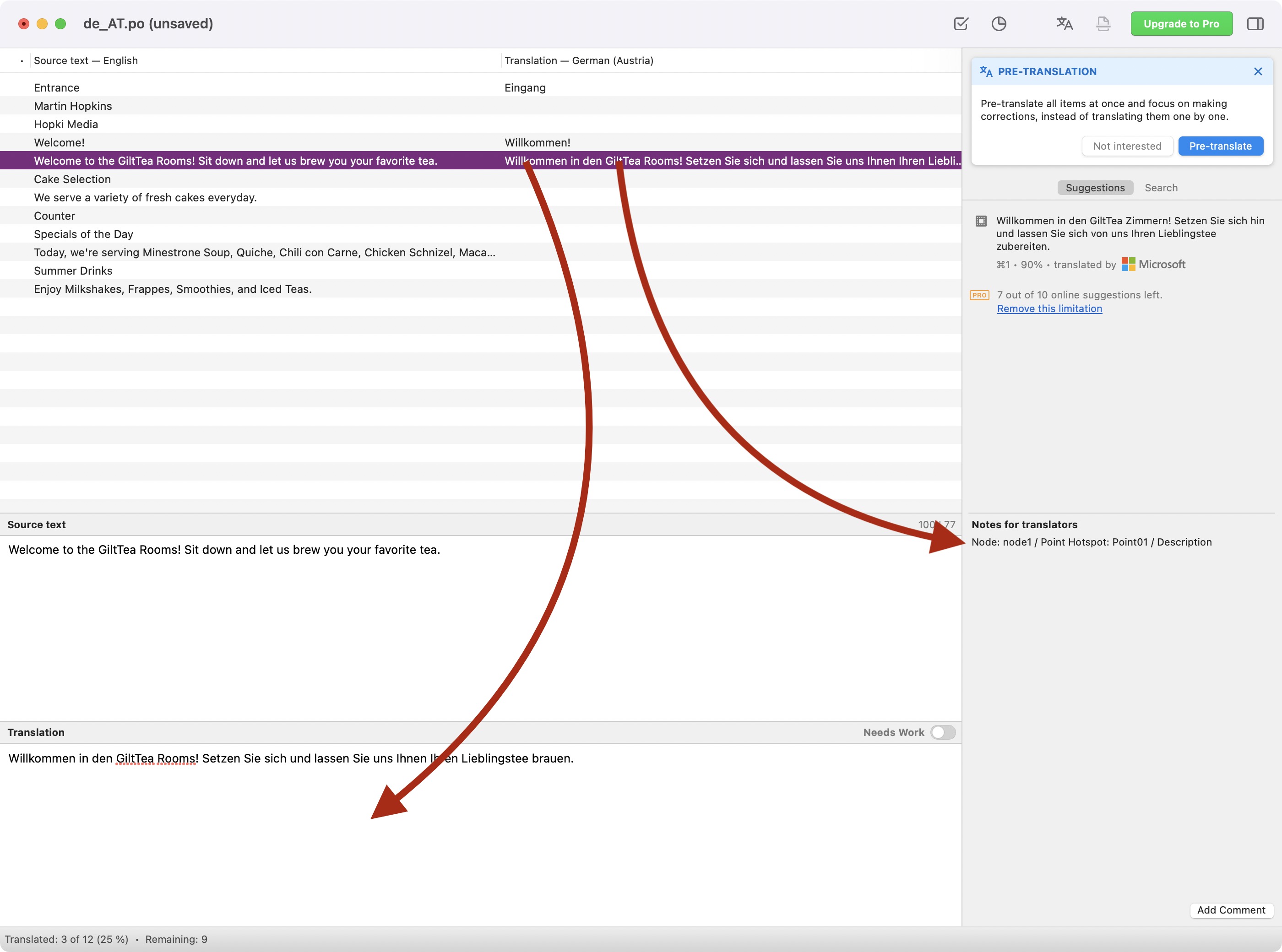 9. Now you can start translating by selecting a line and at the bottom of the screen, for “Translation” type the translation. In the panel at the top-right, there are suggested translations that you can use by clicking on them. However, you can only use this 10 times in the free version. After that, you’ll be asked to upgrade.