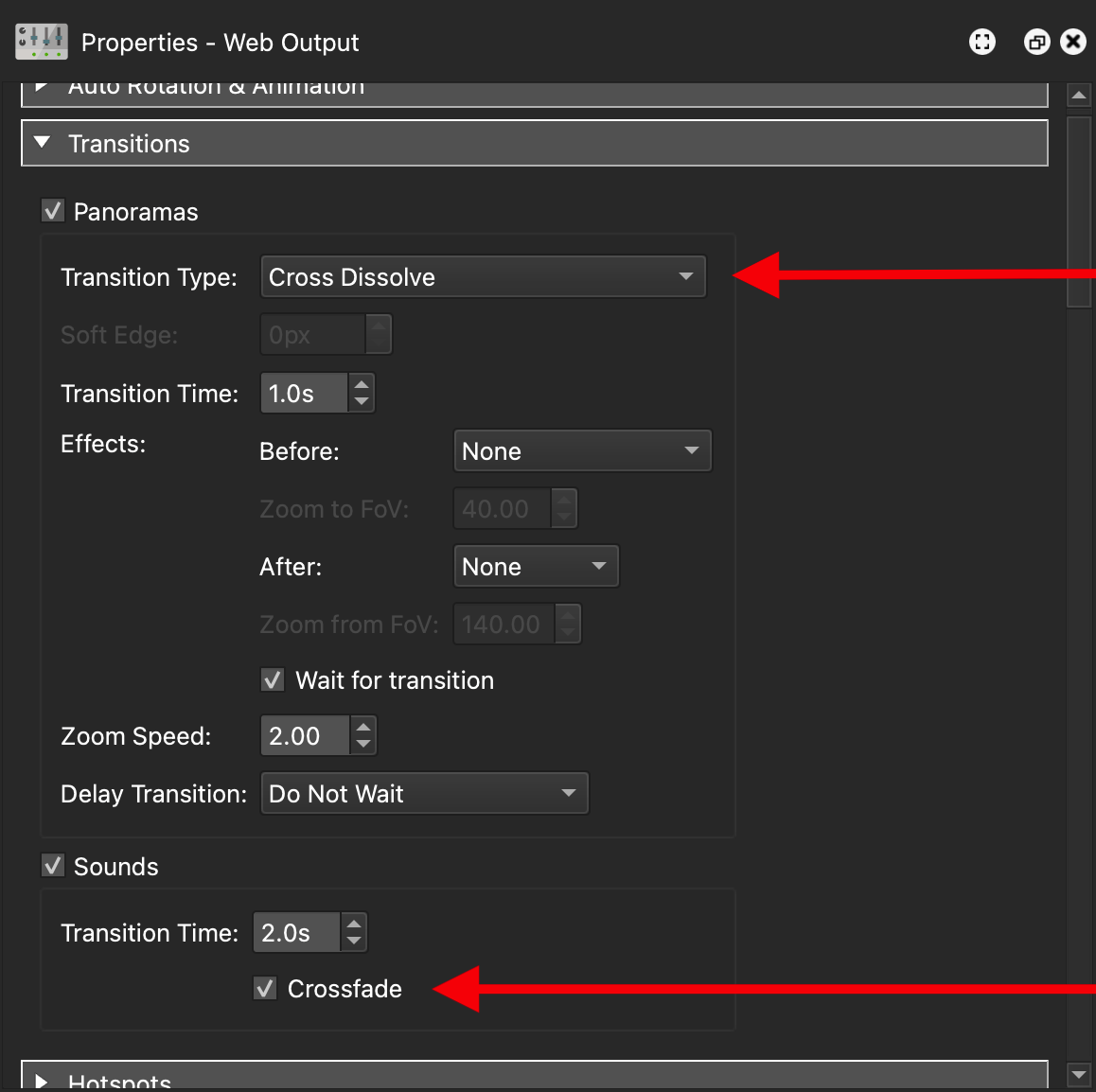 (Optional) Add transitions. For example, add a cross dissolve between the nodes to move smoothly from one node to the next. In the Transitions pane, select Panoramas to enable the transitions. Choose, any transition from the menu. Leave the rest at the defaults.