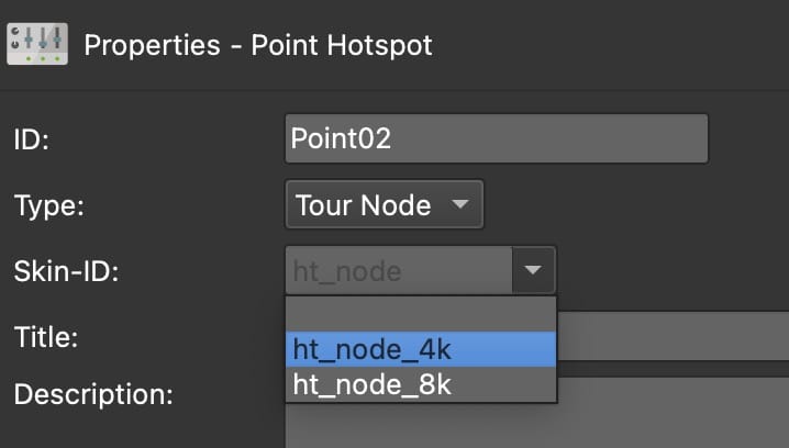 1. Drag a pair of nodes (4k and 8k versions) to the starting panorama to create Tour Node type point hotspots.