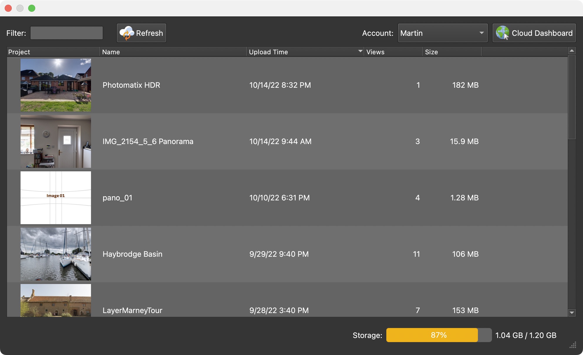 Cloud Dashboard – Opens the Cloud Dashboard where you can manage your account and portfolio in an online webpage. Double-click a project’s thumbnail to open it in a web browser.