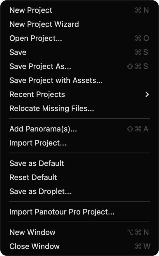 Import Panotour Project… – Import a Panotour Pro project. Learn more about importing PTP projects.