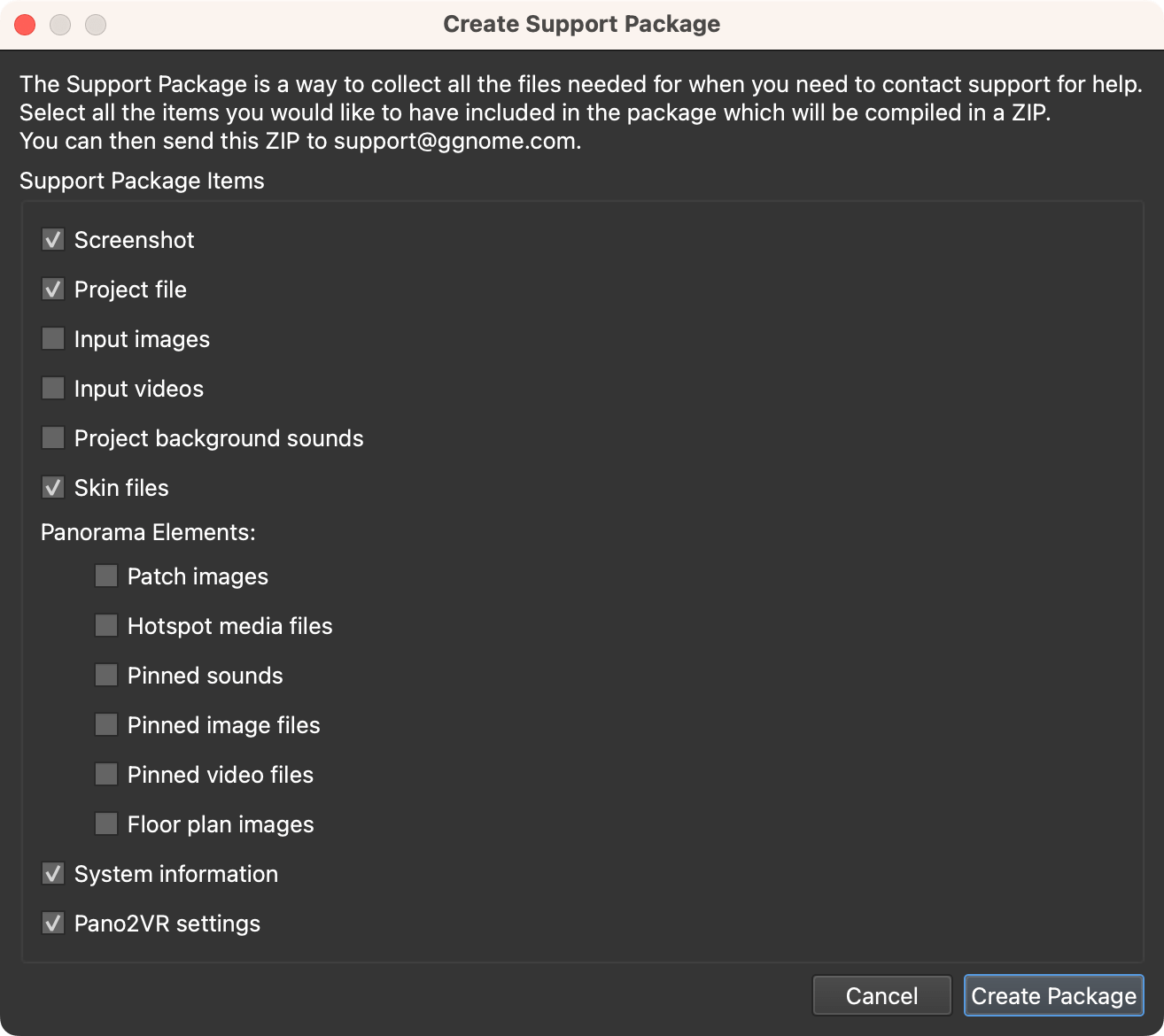 Create Support Package – If you require help and need to contact our support team, you can use this to collect all the files the support team would need to help you. Select the files needed, and hit, Create Package. Pano2VR will collect the files and package them in a ZIP, ready for sending to our support team. If you’re unsure what files to send, just stick with the default selection (Screenshot, Project file, Skin files, System information, Pano2VR settings).