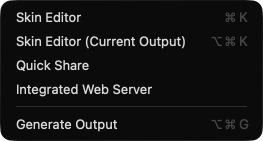 Skin Editor (Current Output) – Opens the skin that is currently set in the Web Output.