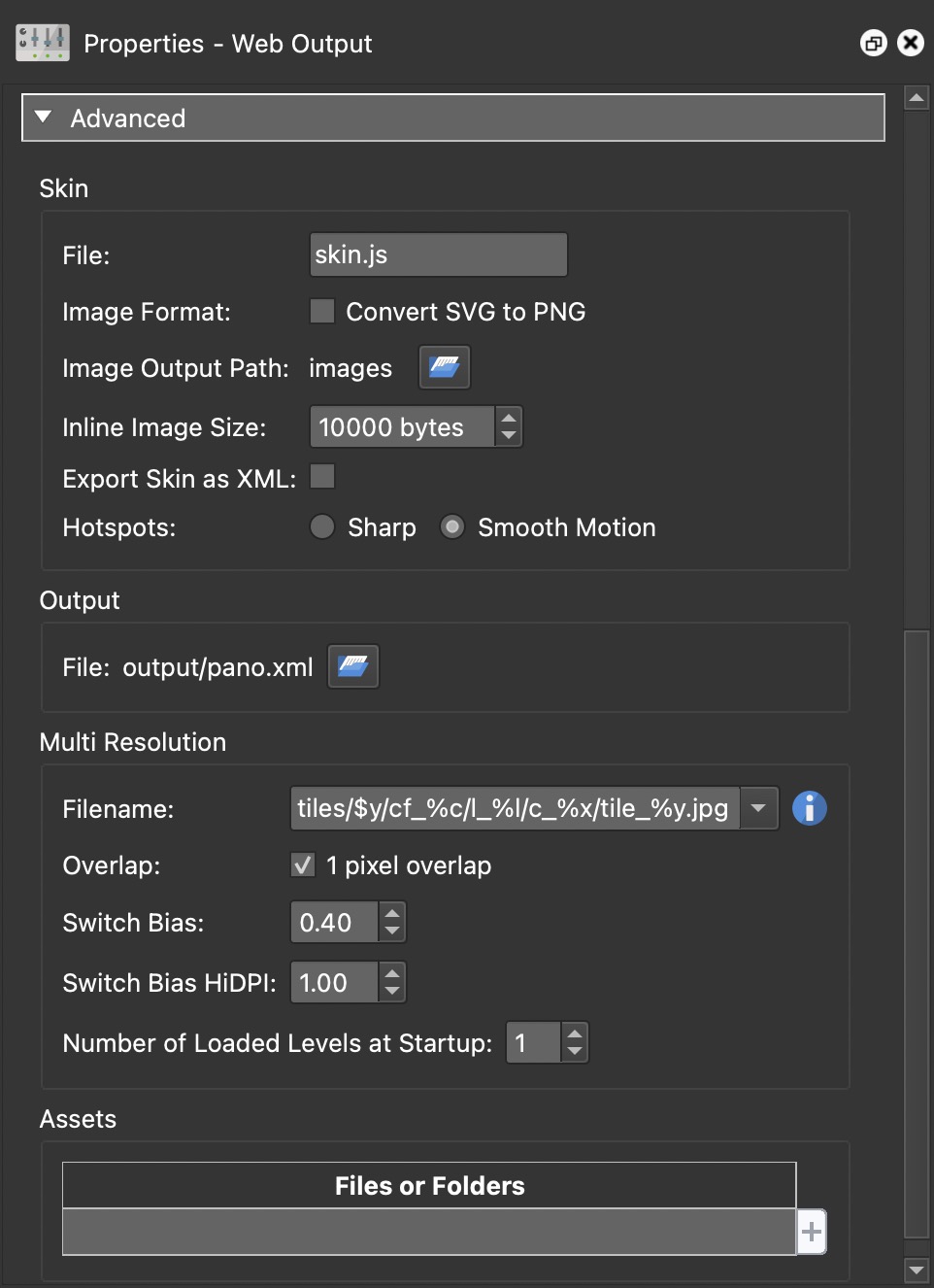Add external media to your project. When you export, Pano2VR will copy these files and folders into an Assets folder inside the Output folder. Any folders you add will become subfolders in the Assets folder.