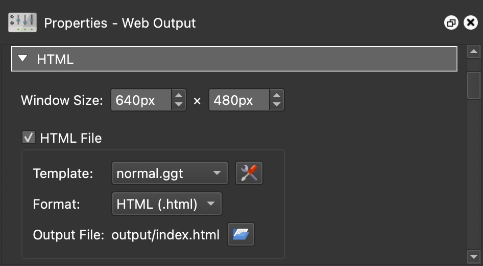 When the Web output is selected from the list of output options, the following settings will be visible. More properties for the web output will open in the properties panel.