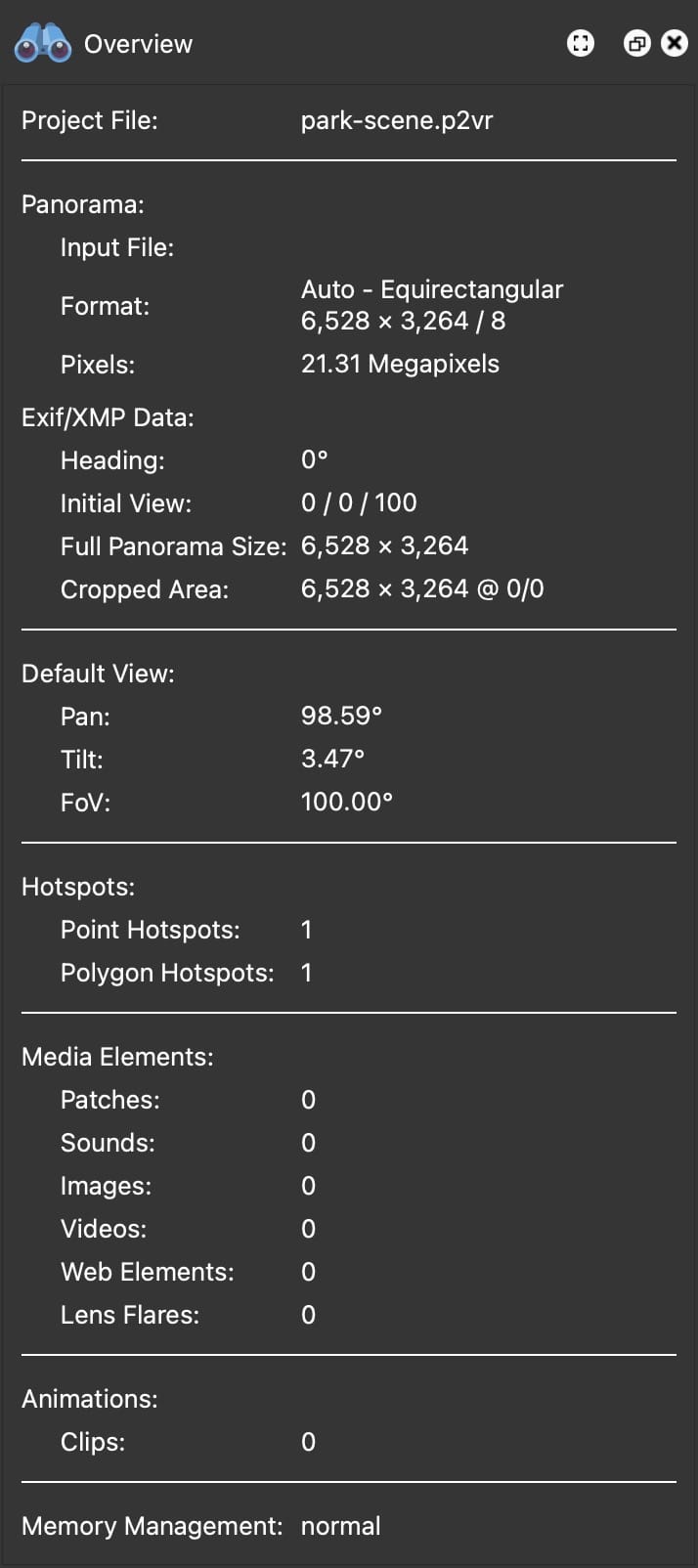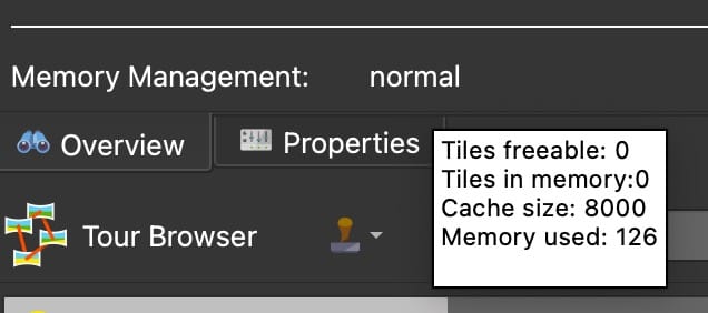 - The number of nodes (and nodes filtered) in the tour and the total pixels of the project