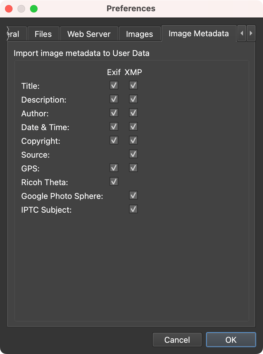 Here you can choose which of the Exif and XMP data you’d like to import from your images.