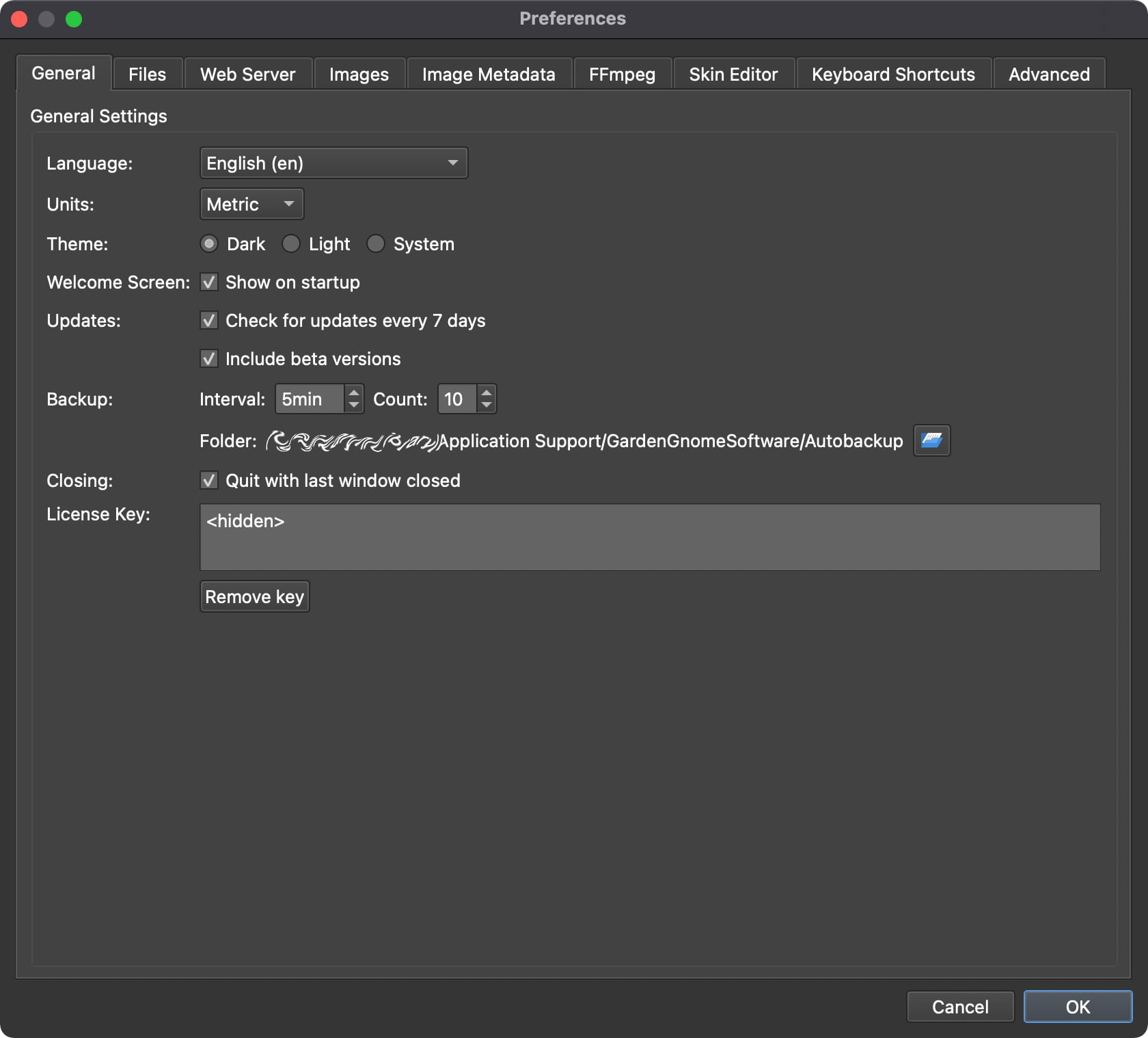 License Key – Add your license key here. When the license is added, <hidden> will be seen in the box. Click Remove Key to remove the key and return to Trial mode (or select the text and hit delete). To add a new key (e.g when upgrading), click Remove Key and paste your new key in the box.