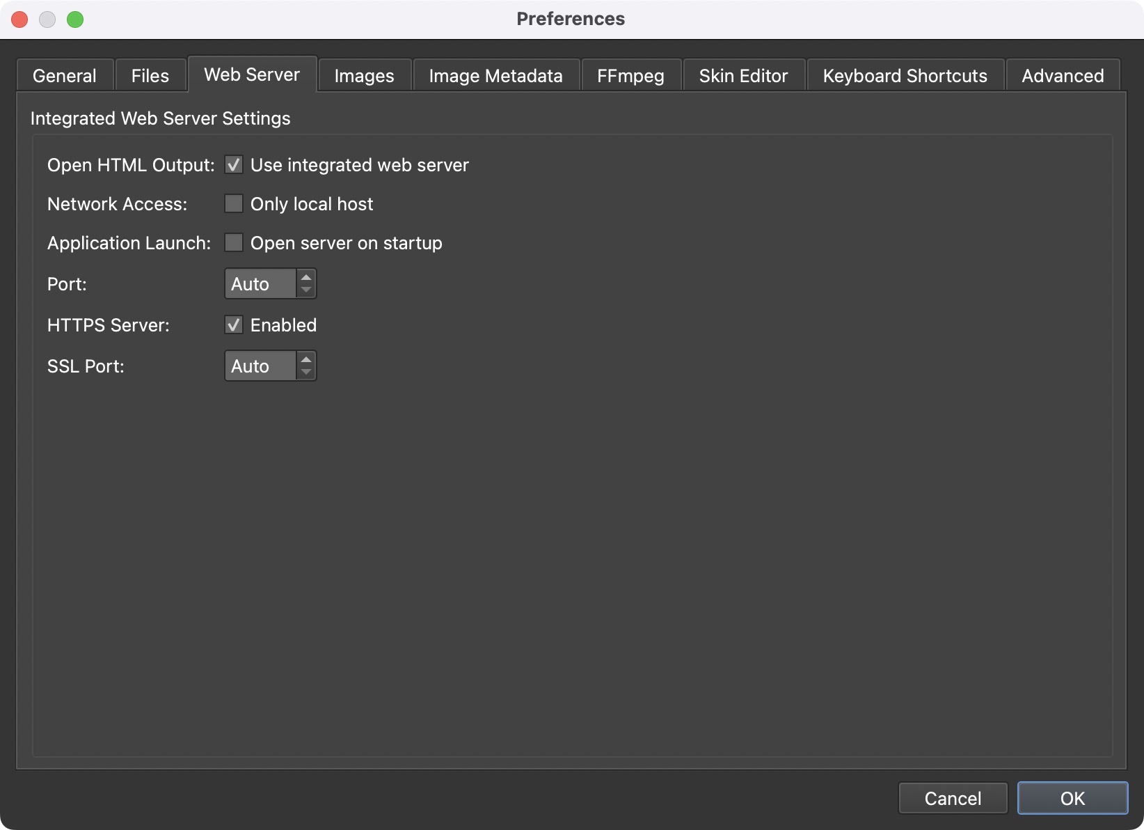 - Open server on startup – Select this to have the web server open and running when Pano2VR opens.